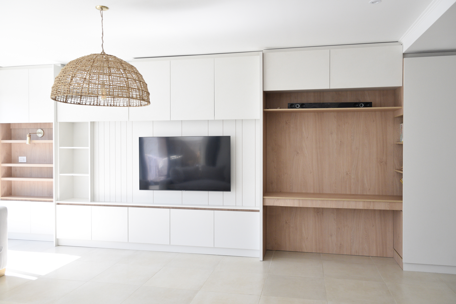 Este mueble de living fue diseñado como una pieza integral, pensada para ordenar el espacio y darle protagonismo a lo importante sin sobrecargar. El rack de TV se integra al conjunto de guardado y estanterías, logrando una composición limpia, equilibrada y visualmente liviana, ideal para un ambiente de uso cotidiano.